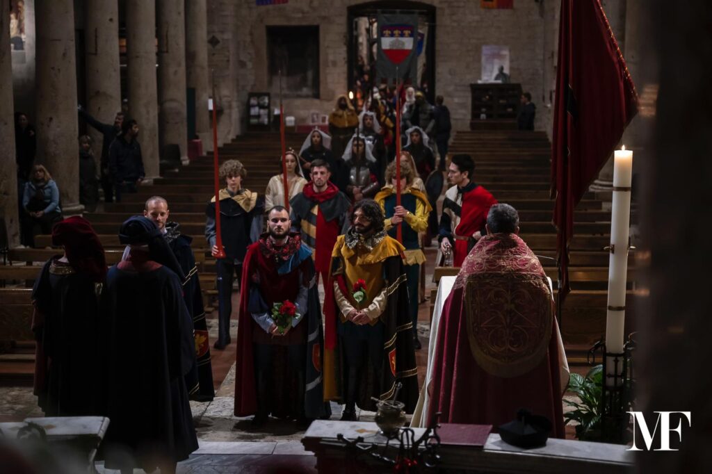 Mezule (10 maggio alle 21.30) – Il corteo sarà composto dai musici, dal porta gonfalone, dalla dama degli anelli che per l’occasione sarà impersonata da Barbara D’Erasmo con le sue ancelle, dai porta lance, dal capo priore Cesare Antonini, dal cerimoniere e dal priore Samuele Nevi.