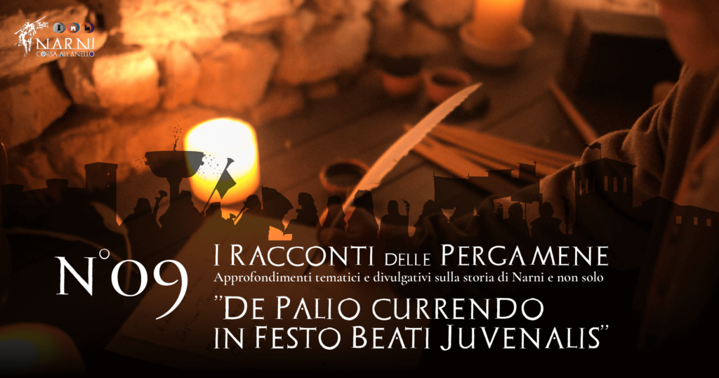 I capitoli IV e V del primo libro degli Statuti narnesi indicano, rispettivamente, le modalità di effettuazione del Palio e della Corsa all’Anello, eventi che si tenevano tradizionalmente in onore del Santo Patrono Giovenale nel mese di Maggio.